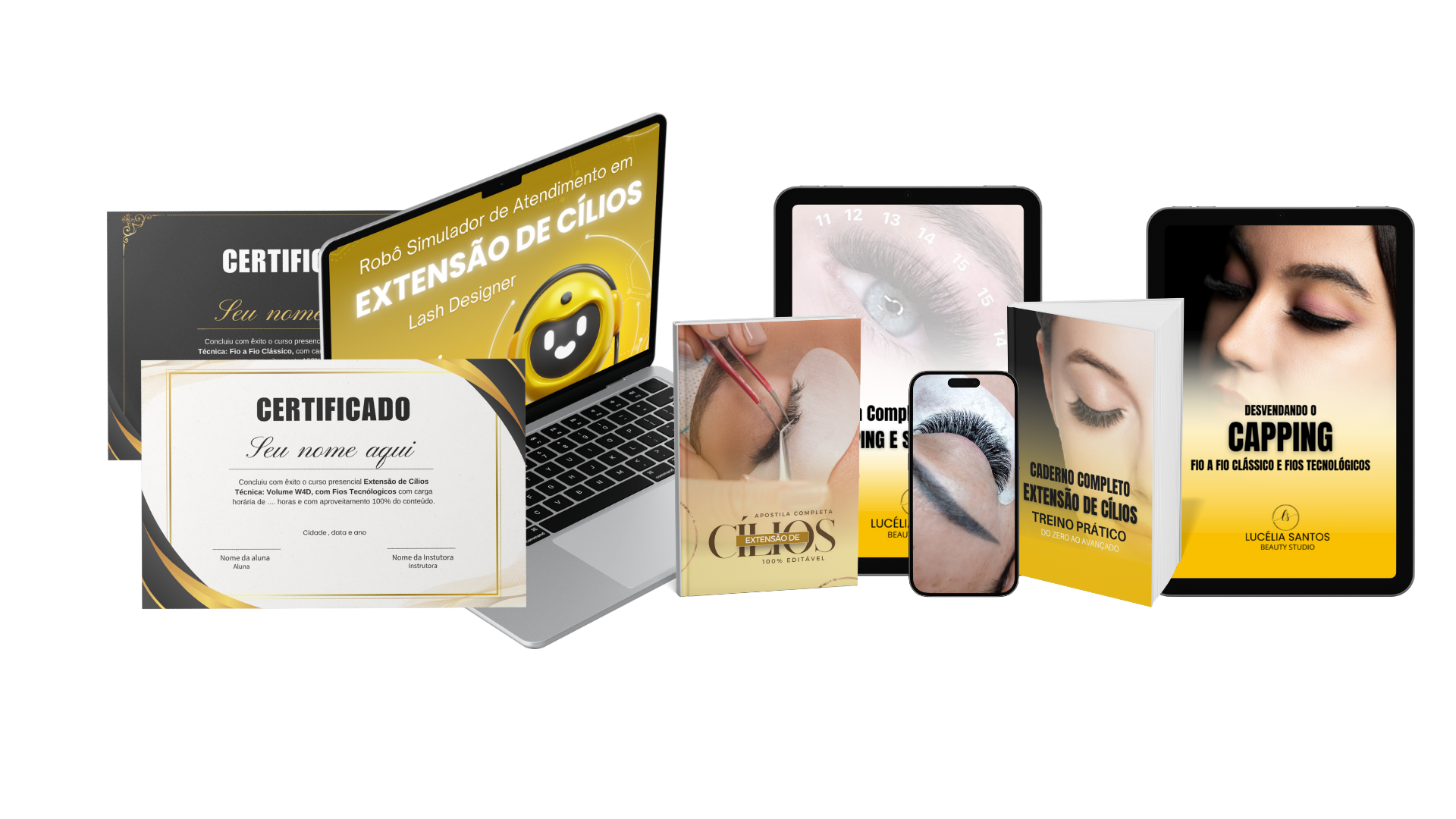 A apostila e o simulador já trazem todo o conteúdo teórico e simulações práticas. Para treinar fisicamente, você pode começar com um kit básico de extensão de cílios (listado na apostila).